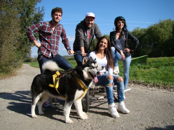 Az idén hazánkban megrendezendő Kutyafogat Hajtó Európa Bajnokságra készülő Lipcsei Péter várta őket 10 Alaszkai malamuttal. Hó hiányában a gyönyörű kutyák kerekes kocsikat húztak a betonon, de Anikó, Vanda, Lali és Karesz így is nagyon élvezte a különleges kalandot.