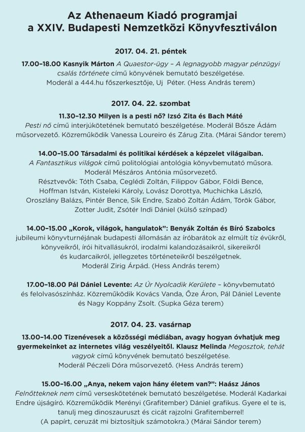 2017. április 21. - 11:26 hir könyv Athenaeum Kiadó Budapesti Nemzetközi Könyvfesztivál A 24. Budapesti Nemzetközi Könyvfesztiválra az Athenaeum Kiadó az alábbi programokkal készül